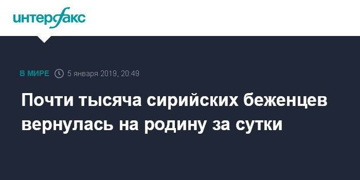 Москва. 5 января. INTERFAX.RU - Российский центр по примирению враждующих сторон и контролю за перемещением беженцев в Сирии сообщает о возвращении в эту страну за сутки почти тысячи беженцев.