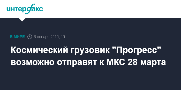 Москва. 6 января. INTERFAX.RU - Транспортный грузовой корабль "Прогресс МС-11" будет запущен к Международной космической станции (МКС) 28 марта вместо 7 февраля, сообщил "Интерфаксу" источник, знакомый с ситуацией.