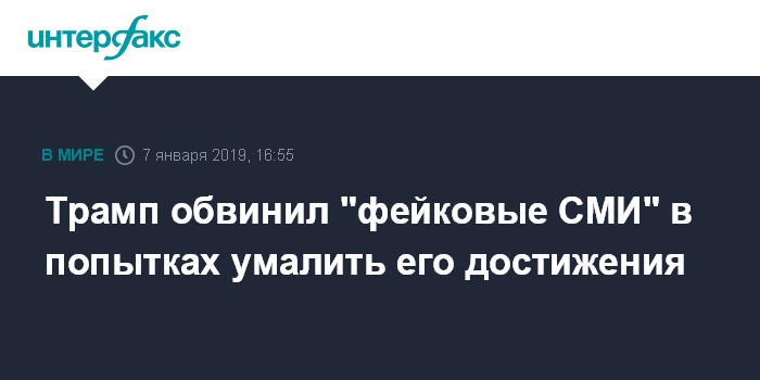 Москва. 7 января. INTERFAX.RU - Президент США Дональд Трамп обвинил в понедельник средства массовой информации в недобросовестной работе с целью принизить успехи его администрации.