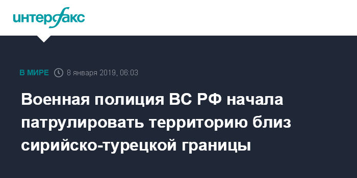 Москва. 8 января. INTERFAX.RU - Военная полиция ВС РФ приступила к патрулированию территории в районе Манбиджа в провинции Алеппо близ сирийско-турецкой границы, сообщил журналистам представитель полиции Юсуп Маматов.