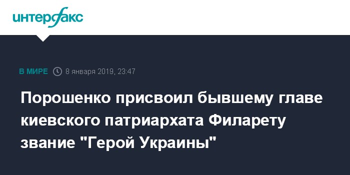 Москва. 8 января. INTERFAX.RU - Президент Украины Петр Порошенко присвоил звание "Герой Украины" с вручением ордена почетному патриарху Православной церкви Украины (ПЦУ) Филарету (Денисенко).