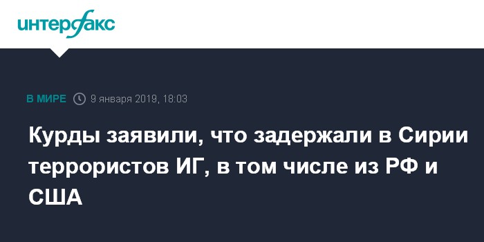 Москва. 9 января. INTERFAX.RU - Курдские "Отряды народной самообороны" (YPG) сообщили о задержании восьми боевиков террористической организации "Исламское государство" (ИГ, запрещена в РФ), сообщает в среду телеканал "Курдистан 24".