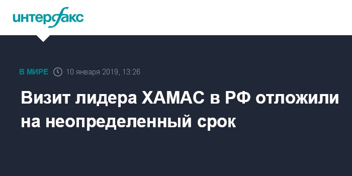 Москва. 10 января. INTERFAX.RU - Визит лидера ХАМАС Исмаила Хании в Москву 15 января и его переговоры с главой МИД РФ Сергеем Лавровым не состоится, он отложен на неопределенное время. Об этом сообщил "Интерфаксу" посол Палестины в РФ Абдель Хафиз Нофаль.