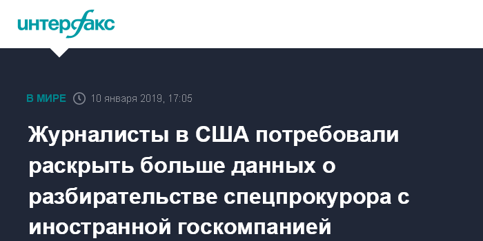 Москва. 10 января. INTERFAX.RU - Американский Комитет репортеров за свободу прессы направил в ряд судебных инстанций США требование обнародовать больше данных о разбирательстве команды спецпрокурора Роберта Мюллера в отношении неназванной иностранной госкомпании, сообщает американское издание Politico.