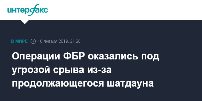 Москва. 10 января. INTERFAX.RU - Сотрудники ФБР предупредили, что частичная приостановка работы правительства США (шатдаун) ставит под угрозу их возможности по содержанию кадрового состава и расследованию преступлений, сообщают западные СМИ со ссылкой на заявление ведомства.