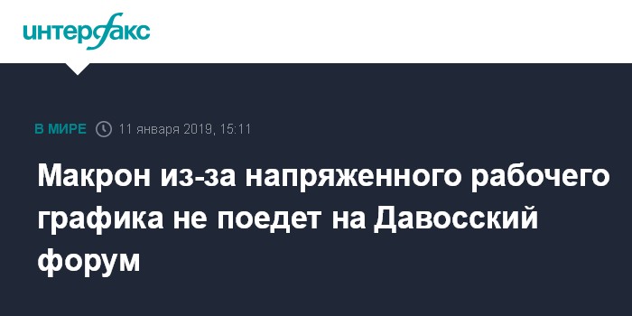 Москва. 11 января. INTERFAX.RU - Президент Франции Эммануэль Макрон не поедет на Всемирный экономический форум в швейцарский Давос, сообщает в пятницу газета Le Figaro со ссылкой на Елисейский дворец.