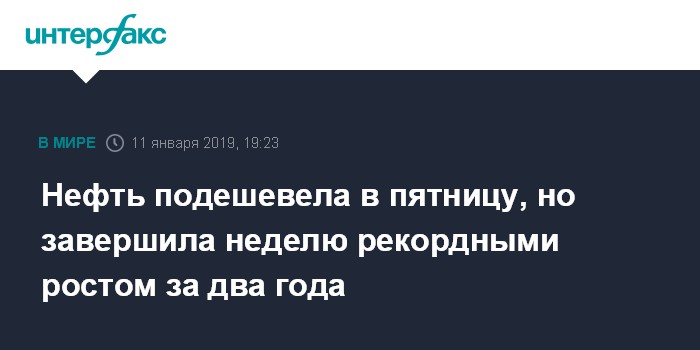 Москва. 11 января. INTERFAX.RU - Цены на нефть эталонных марок опускаются в ходе торгов в пятницу, однако завершают неделю максимальным ростом за два года на оптимизме по поводу сокращения поставок со стороны ОПЕК+ и роста мировой экономики.
