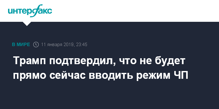Москва. 11 января. INTERFAX.RU - Президент США Дональд Трамп подтвердил, что не намерен прямо сейчас вводить режим чрезвычайного положения в стране и ожидает решения Конгресса США по выделению средств на строительство стены на границе с Мексикой, приводит пресс-пул Белого дома слова президента.