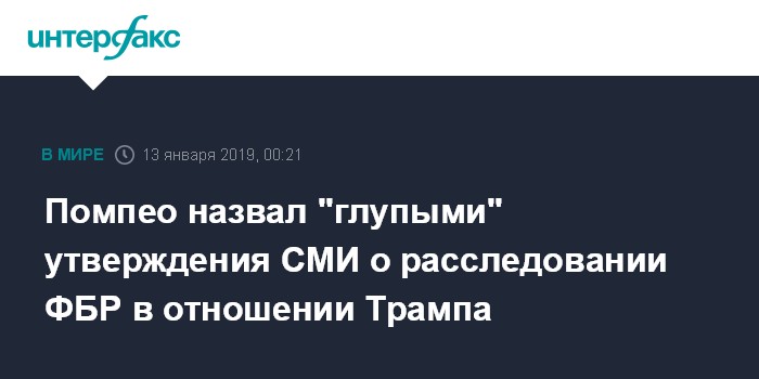 Москва. 13 января. INTERFAX.RU - Госсекретарь США Майк Помпео раскритиковал публикацию газеты The New York Times о том, что в ФБР проводили негласное расследование о возможных связях президента страны Дональда Трампа с РФ.