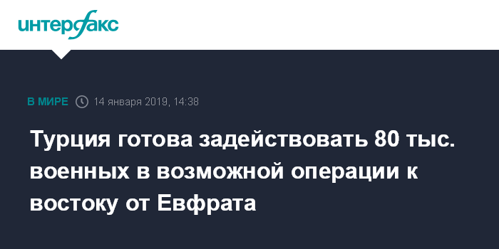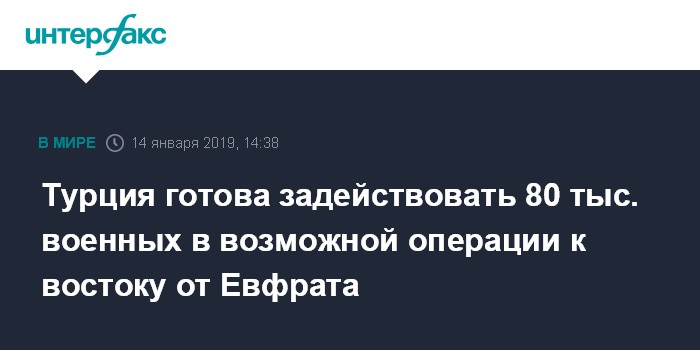 Москва. 14 января. INTERFAX.RU - Около 80 тысяч турецких военнослужащих готовы принять участие в возможной операции вооруженных сил Турции в Сирии восточнее реки Евфрат, а также в районе Манбиджа, сообщает в понедельник издание "Йени шафак".