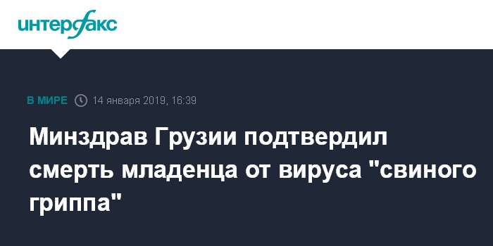 Москва. 14 января. INTERFAX.RU - В Грузии десятимесячный ребенок скончался от вируса так называемого свиного гриппа (H1N1 - подтип вируса гриппа А), сообщают в понедельник грузинские СМИ.