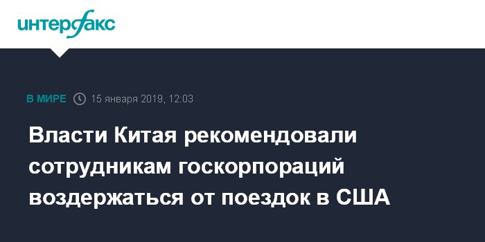 Москва. 15 января. INTERFAX.RU - Власти Китая рекомендовали руководителям и сотрудникам ряда госкорпораций избегать поездок в США, а также предпринимать дополнительные меры для защиты электронных устройств и информации на них в путешествиях, сообщает агентство Bloomberg со ссылкой на информированные источники.