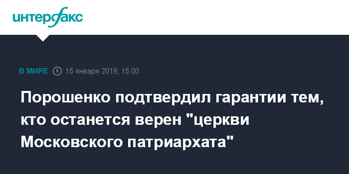 Москва. 15 января. INTERFAX.RU - Петр Порошенко заявил, что как президент Украины гарантирует защиту и тем, кто перешел в новую православную церковь, и тем, кто остался верен "церкви Московского патриархата".