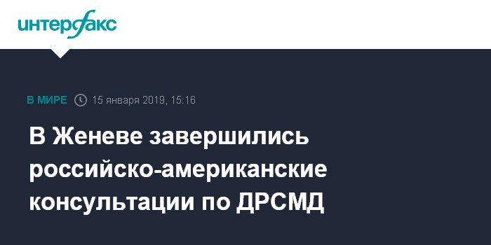Москва. 15 января. INTERFAX.RU - Межведомственные российско-американские консультации по Договору о ликвидации ракет средней и меньшей дальности (ДРСМД) завершились в Женеве, передает корреспондент "Интерфакса".