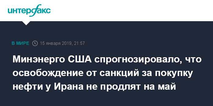 Москва. 15 января. INTERFAX.RU - Минэнерго США в своем прогнозе, который включает 2020 год, предполагает, что нефтяные санкции США против Ирана останутся в силе до конца прогнозируемого периода, пишет ведомство.