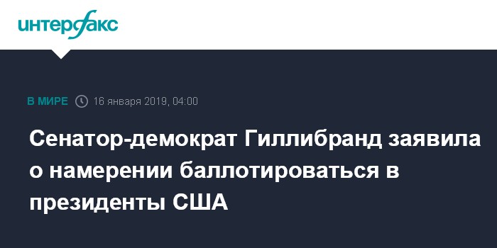 Москва. 16 января. INTERFAX.RU - Сенатор от Демократической партии США Кирстен Гиллибранд сообщила, что намерена выставить свою кандидатуру на выборах президента США в 2020 году.