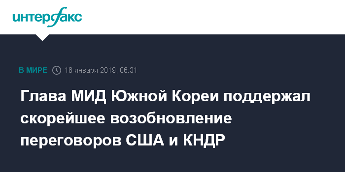Москва. 16 января. INTERFAX.RU - Министр иностранных дел Южной Кореи Кан Ген Хва считает, что переговоры между Вашингтоном и Пхеньяном по вопросу денуаклеризации скоро продолжатся.