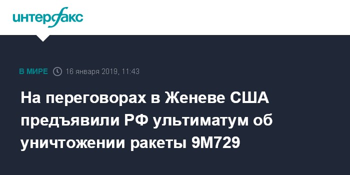 Москва. 16 января. INTERFAX.RU - Позиция США на переговорах по Договору о ликвидации ракет средней и меньшей дальности в Женеве заключалась в ультиматуме, предполагающем уничтожение ракеты 9М729, заявил в среду глава МИД РФ Сергей Лавров.