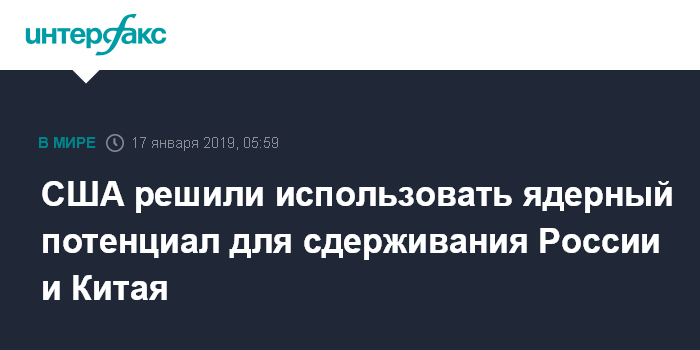 Москва. 17 января. INTERFAX.RU - Для сдерживания России и Китая Соединенные Штаты должны полагаться на свой ядерный арсенал, заявил журналистам высокопоставленный представитель Белого дома на условиях анонимности.