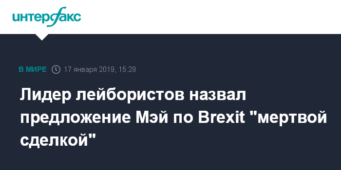 Москва. 17 января. INTERFAX.RU - Лидер оппозиционной Лейбористской партии Великобритании Джереми Корбин считает, что соглашение премьер-министра Великобритании Терезы Мэй по Brexit является "мертвой сделкой".