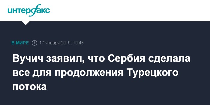 Москва. 17 января. INTERFAX.RU - Сербия сделала все для строительства продолжения газопровода "Турецкий поток" на своей территории, заявил президент страны Александр Вучич на пресс-конференции по итогам переговоров с президентом РФ Владимиром Путиным.
