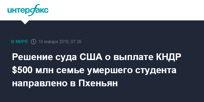 Москва. 18 января. INTERFAX.RU - Суд США отправил Северной Корее свое решение о том, что коммунистическое государство должно заплатить $501 млн за ущерб родителям американского студента Отто Вомбиера, арестованного в КНДР, а позже скончавшегося, сообщает "Голос Америки".