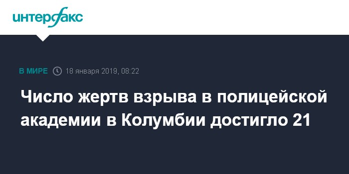 Москва. 18 января. INTERFAX.RU - До 21 человека увеличилось число погибших при взрыве в полицейской академии в Боготе, еще 68 пострадали, сообщает колумбийская радиосеть "Караколь".