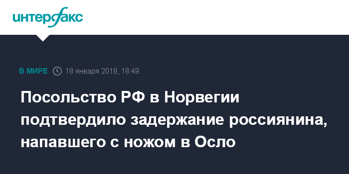 Москва. 18 января. INTERFAX.RU - В посольстве РФ в Норвегии подтвердили задержание россиянина, совершившего нападение с ножом в магазине в Осло.
