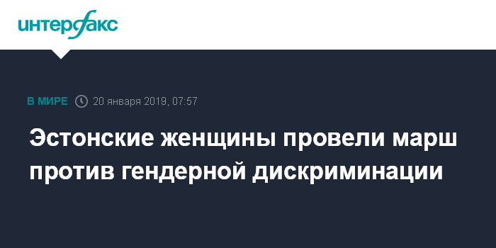 Москва. 20 января. INTERFAX.RU - Несколько сотен женщин в субботу вышли на улицы Таллина с плакатами против гендерного неравноправия, физического и психологического насилия, за равную с мужчинами зарплату, возможности карьерного роста.