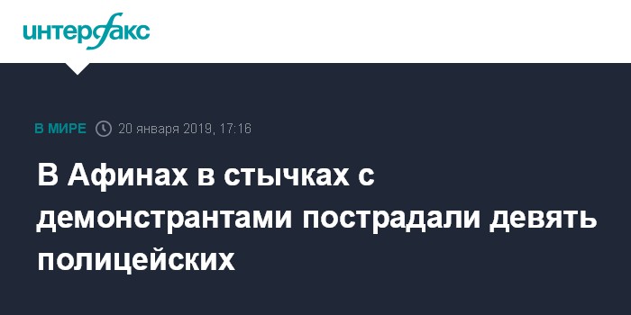 Москва. 20 января. INTERFAX.RU - Между полицией и гражданами, участвующими в Афинах в протестах против соглашения с Македонией, произошли столкновения, сообщает в воскресенье агентство Associated Press.