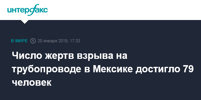 Москва. 20 января. INTERFAX.RU - 79 человек погибли при взрыве на трубопроводе в мексиканском муниципалитете Тлауэлильпан, сообщает в воскресенье агентство ЭФЭ со ссылкой на министерство здравоохранения страны.