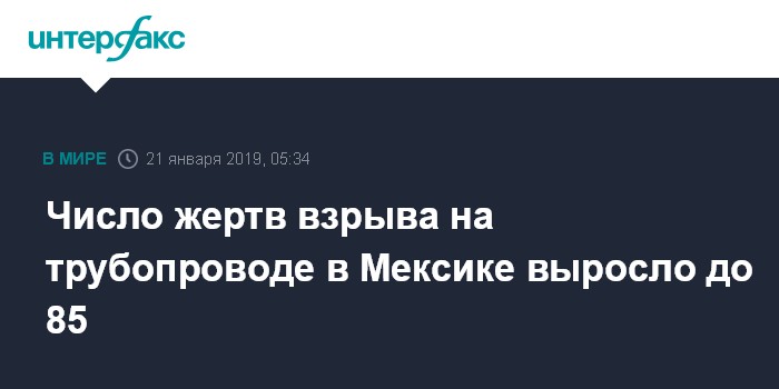 Москва. 21 января. INTERFAX.RU - 85 человек погибли при взрыве на трубопроводе в мексиканском муниципалитете Тлауэлильпан, сообщает в понедельник агентство Associated Press.