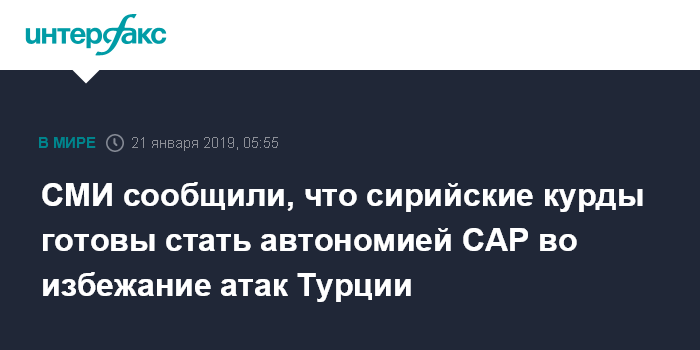 Москва. 21 января. INTERFAX.RU - Сирийские курды готовы предложить президенту Сирии Башару Асаду сформировать курдскую автономию в составе арабской республики после вывода из нее американских войск, сообщила в понедельник британская The Times.