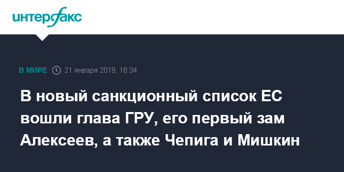 Москва. 21 января. INTERFAX.RU - В опубликованном в понедельник санкционном списке ЕС по химоружию фигурируют начальник ГРУ Игорь Костюков, его первый заместитель Владимир Алексеев, а также Анатолий Чепига и Александр Мишкин. Документ c данными о попавших под санкции людях в понедельник опубликован в "Официальном журнале ЕС".