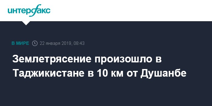 Москва. 22 января. INTERFAX.RU - Землетрясение произошло в 10 км восточнее Душанбе в 9:33 по местному времени, сообщила во вторник Геофизическая служба АН Таджикистана.