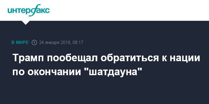 Москва. 24 января. INTERFAX.RU - Президент США Дональд Трамп заявил, что выступит с обращением к нации по окончании шатдауна - приостановки работы госучреждений из-за отсутствия финансирования.