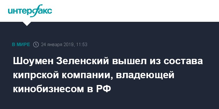 Москва. 24 января. INTERFAX.RU - Шоумен Владимир Зеленский, заявивший о своем намерении участвовать в выборах президента Украины, вышел из состава кипрской компании Green Family LTD, которой принадлежит российская кинокомпания "Грин Филмc", фигурировавшая в журналистском расследовании программы "Схемы", сообщает ТСН.