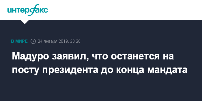 Москва. 24 января. INTERFAX.RU - Президент Венесуэлы Николас Мадуро заявил в четверг, что не намерен уходить со своего поста до завершения мандата - в 2025 году, передают латиноамериканские СМИ.