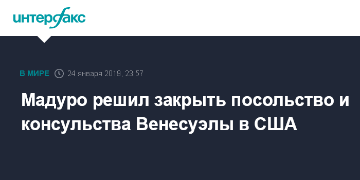 Москва. 24 января. INTERFAX.RU - Президент Венесуэлы Николас Мауро объявил в четверг о решении закрыть посольство и все консульства страны в США, передают латиноамериканские СМИ.