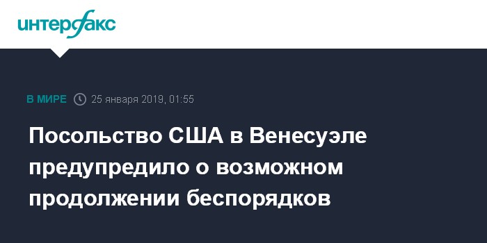 Москва. 25 января. INTERFAX.RU - Сотрудники посольства США в Венесуэле предупредили сограждан, что в ближайшие дни акции протеста в Венесуэле, вероятно, продолжатся.