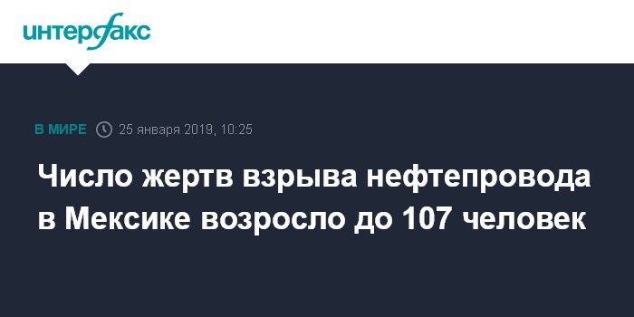 Москва. 25 января. INTERFAX.RU - Число погибших в результате взрыва нефтепровода в мексиканском штате Идальго увеличилось до 107 человек, сообщают в пятницу западные СМИ со ссылкой на региональные власти.