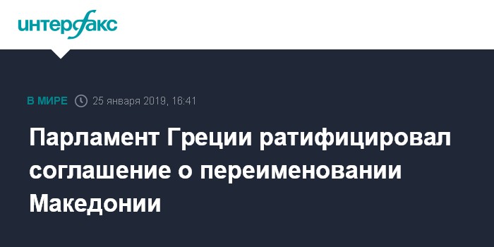 Москва. 25 января. INTERFAX.RU - Греческий парламент одобрил соглашение о переименовании Бывшей югославской республики Македония в Республику Северная Македония, сообщает "Би-би-си".