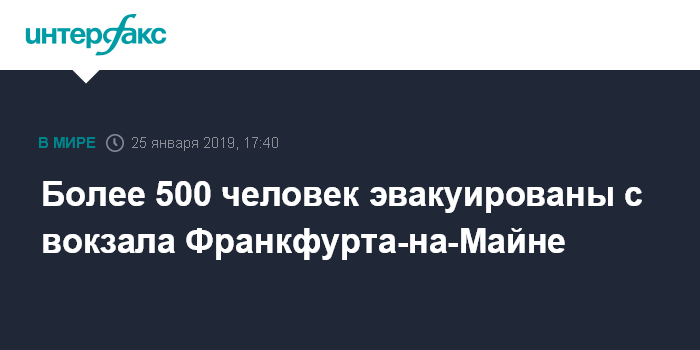 Москва. 25 января. INTERFAX.RU - Сотрудники служб безопасности эвакуировали 500 человек из поезда на вокзале Франкфурта-на-Майне после поступления информации о возможной угрозе взрыва, говорится в сообщении городской полиции в твиттере.