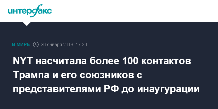 Москва. 26 января. INTERFAX.RU - Президент США Дональд Трамп и его ближайшие советники контактировали с представителями России, Wikileaks и посредниками более 100 раз в ходе президентской кампании 2016 года и до его инаугурации на посту, пишет в субботу газета The New York Times со ссылкой на собственное расследование.