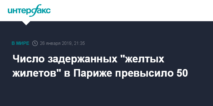 Москва. 26 января. INTERFAX.RU - Более 50 человек были задержаны в ходе акции протеста "желтых жилетов" в Париже в субботу, сообщает в субботу телеканал BFMTV.