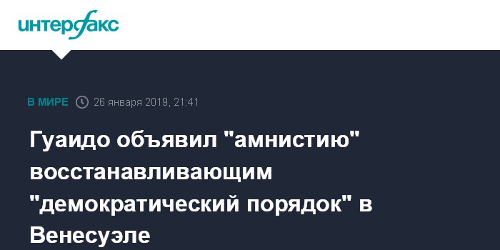 Москва. 26 января. INTERFAX.RU - Лидер венесуэльской оппозиции Хуан Гуаидо, провозгласивший себя президентом страны, в субботу объявил "амнистию" всем, кто сотрудничает с оппозицией ради "восстановления демократии".