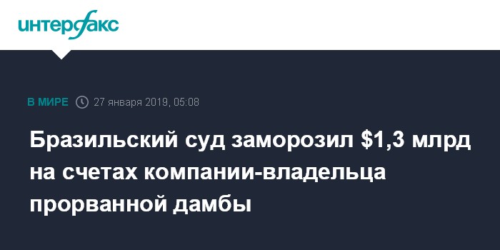 Москва. 27 января. INTERFAX.RU - Суд бразильского штата Минас-Жерайс заморозил 5 миллиардов реалов (1,3 миллиарда долларов) на счетах горнодобывающей компании Vale, чтобы обеспечить компенсацию ущерба от прорыва дамбы, сообщило издание Veja.