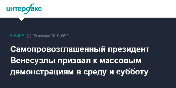Москва. 28 января. INTERFAX.RU - Хуан Гуаидо, провозгласивший себя временным президентом Венесуэлы, выступил с призывом к населению страны принять участие в массовых выступлениях в среду и субботу.