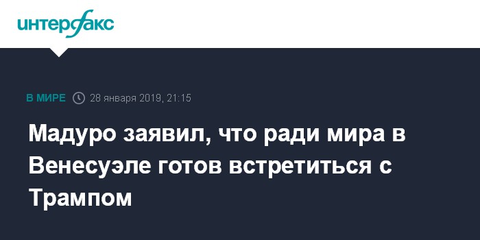 Москва. 28 января. INTERFAX.RU - Президент Венесуэлы Николас Мадуро готов встретиться с президентом США Дональдом Трампом, сообщают в понедельник латиноамериканские СМИ со ссылкой на главу МИД Венесуэлы Хорхе Арреасу.