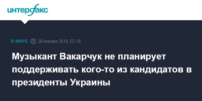 Москва. 29 января. INTERFAX.RU - Музыкант и общественный деятель Святослав Вакарчук, который не намерен участвовать в выборах президента Украины, отмечает, что не планирует поддерживать кого-то из претендентов на пост главы государства.